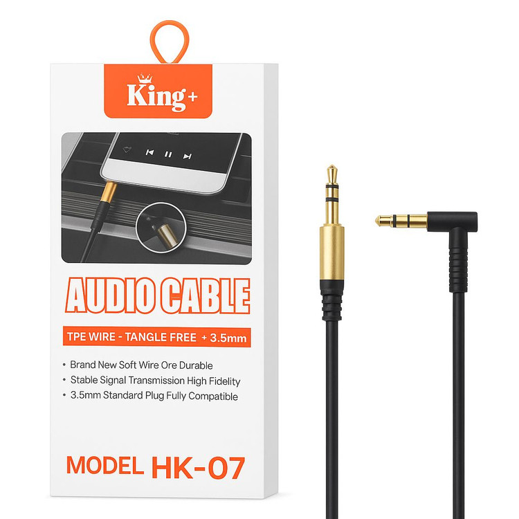 کابل صدا **King+ مدل HK-07** یک کابل **AUX استریو** با طراحی باکیفیت و مقاوم است که برای انتقال صدای شفاف و بدون نویز بین دستگاههای مختلف طراحی شده است. این کابل دارای یک کانکتور مستقیم و یک کانکتور **خم ۹۰ درجه** است که اتصال راحتتری را در فضاهای محدود مانند خودرو یا پشت سیستمهای صوتی فراهم میکند.